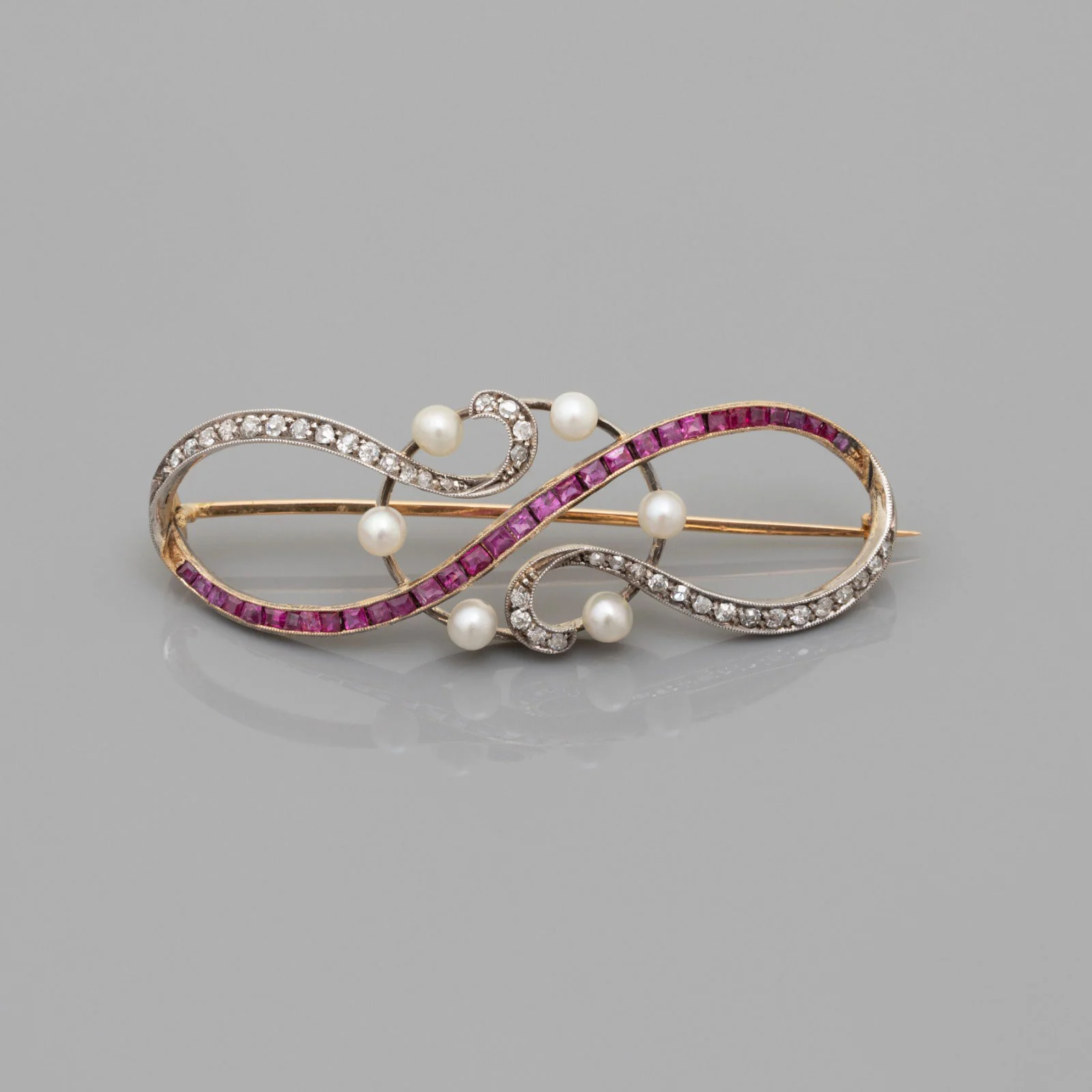 Cravejado com 32 rubis, 6 pérolas e 38 diamantes talhe antigo de brilhante.