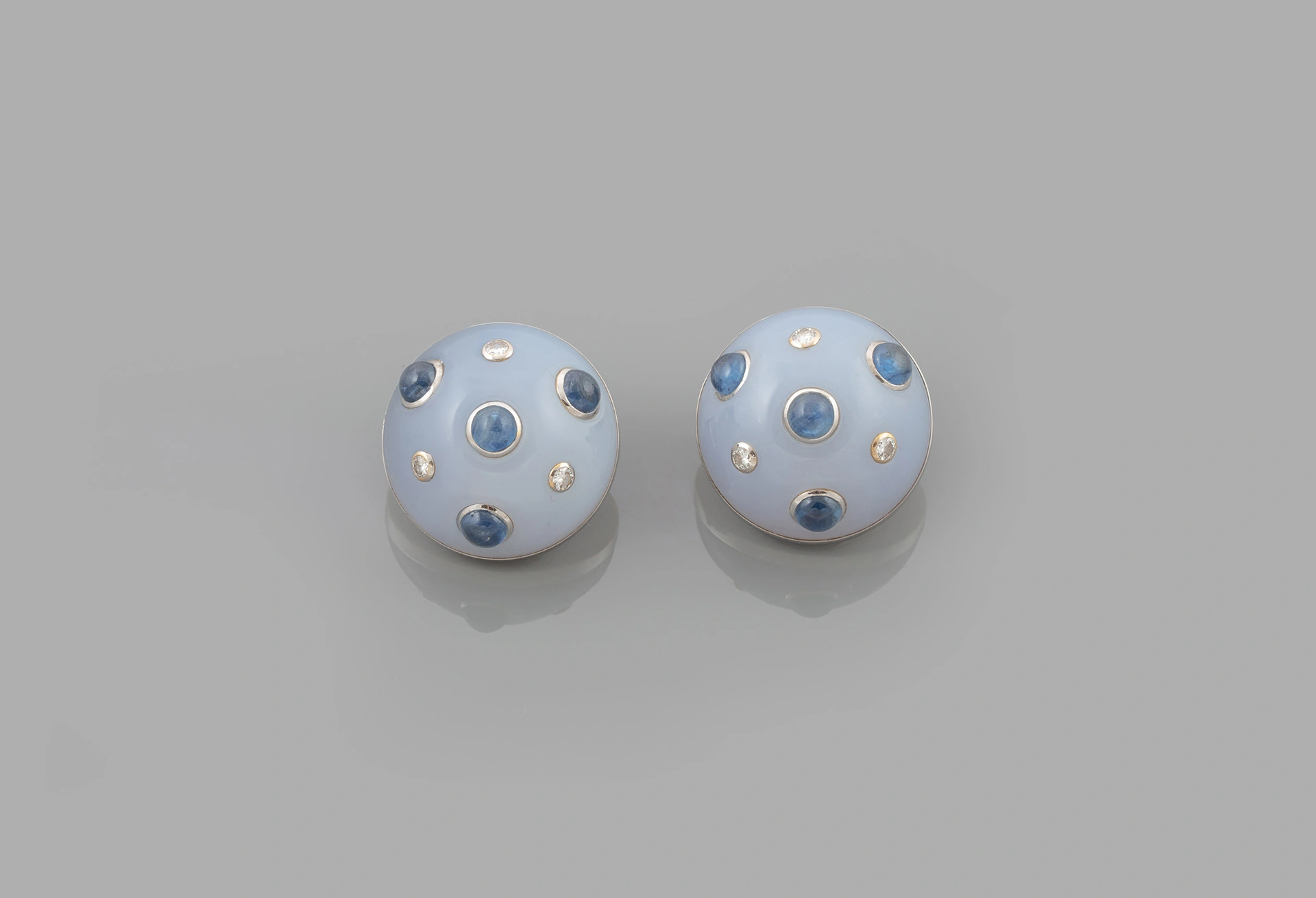 Aplicação de calcedónia azul em talhe cabochon, cravejados com 8 safiras azuis em talhe cabochon e 6 diamantes em talhe de brilhante.