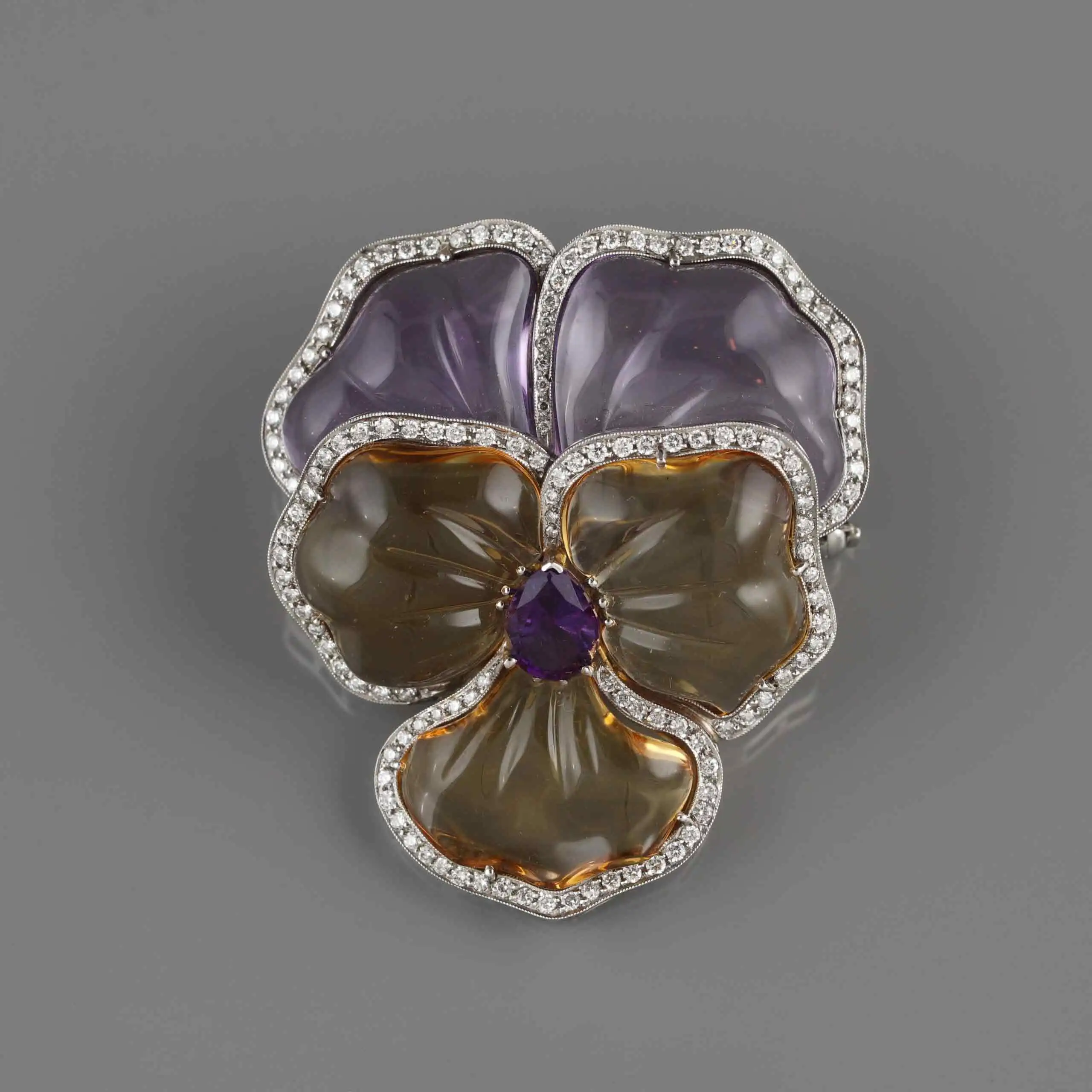 Platina (900‰),ouro branco (800‰/19,2k), diamantes, ametistas e citrinos.