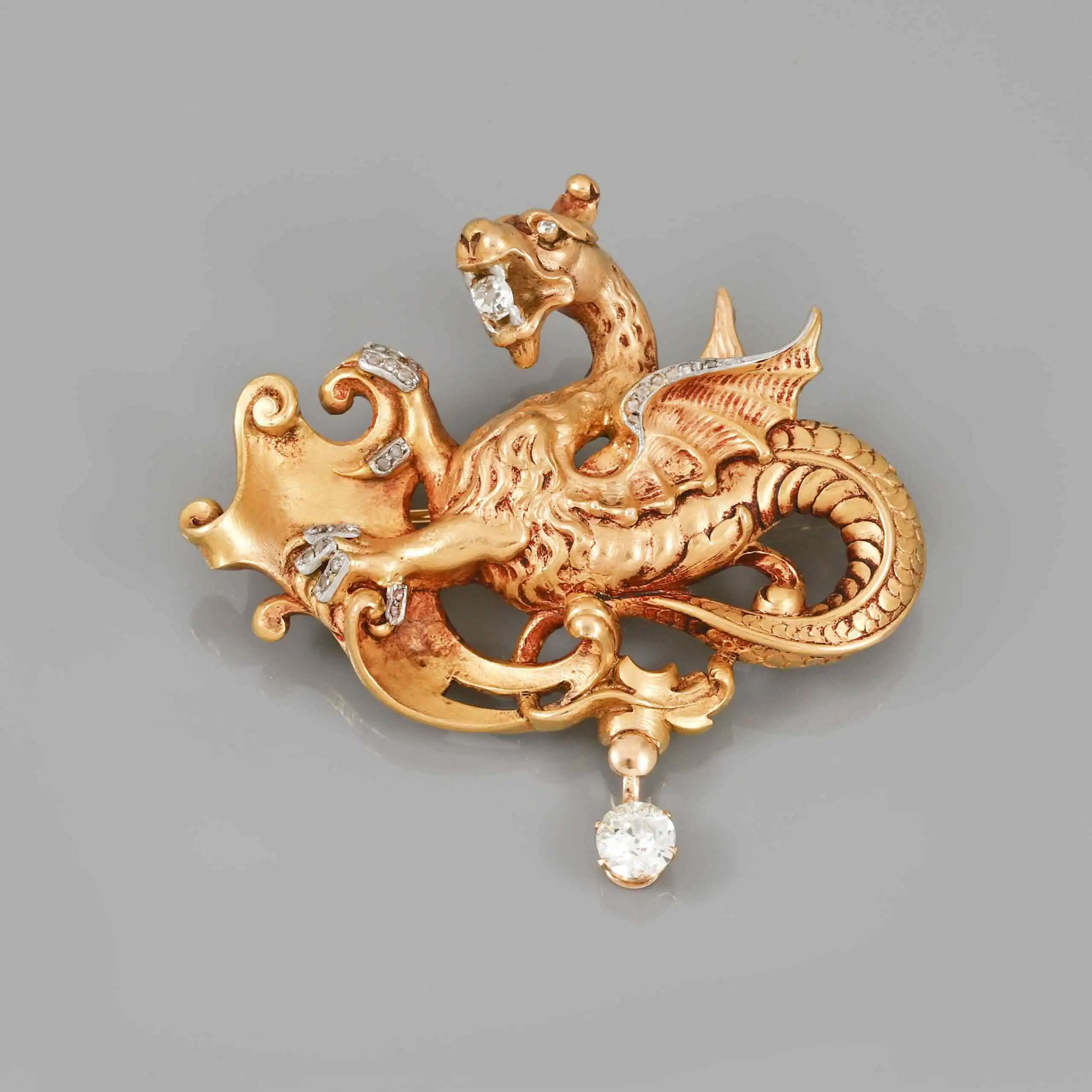 Alfinete de ouro, cravejado com diamantes, em forma de dragão da Leitão & Irmão.