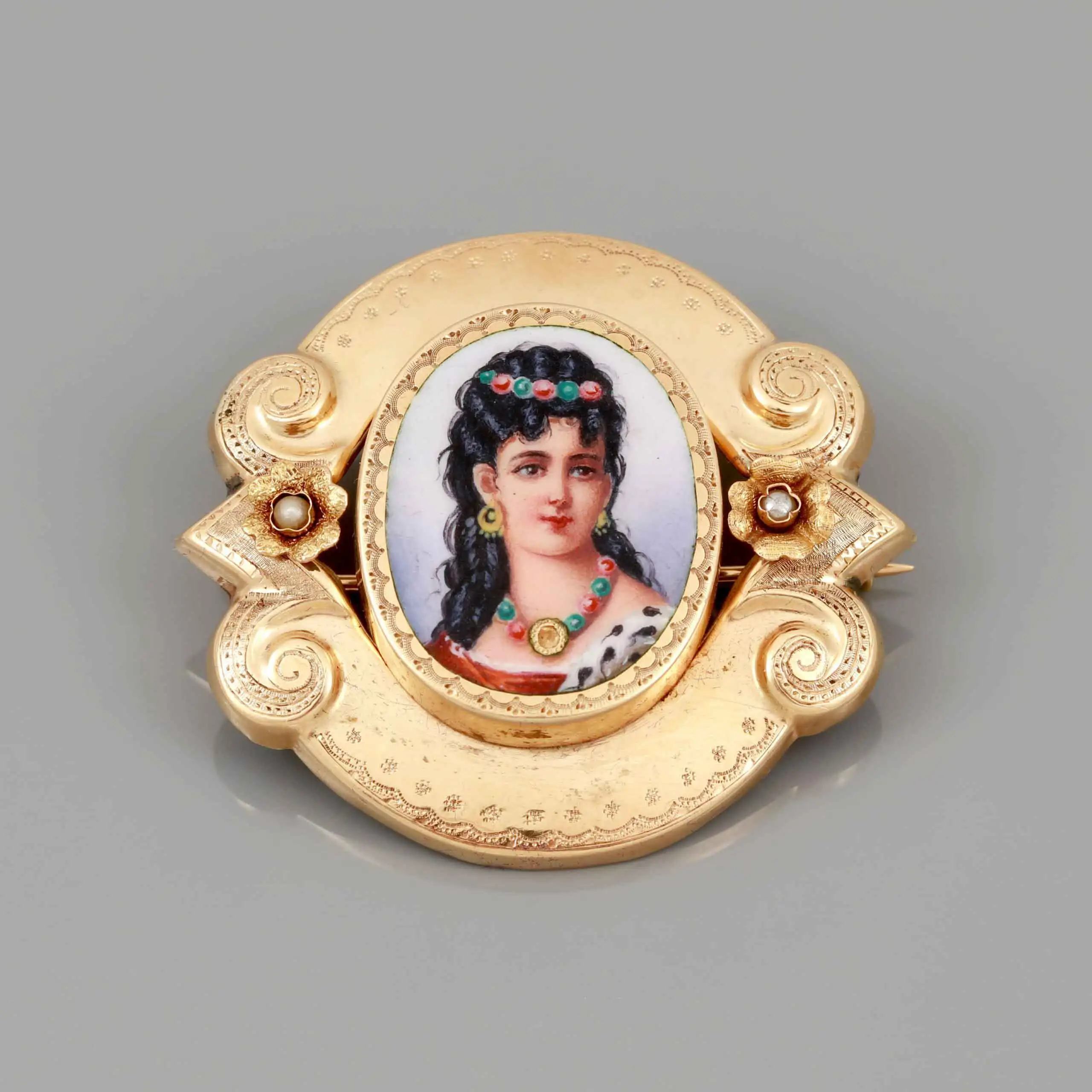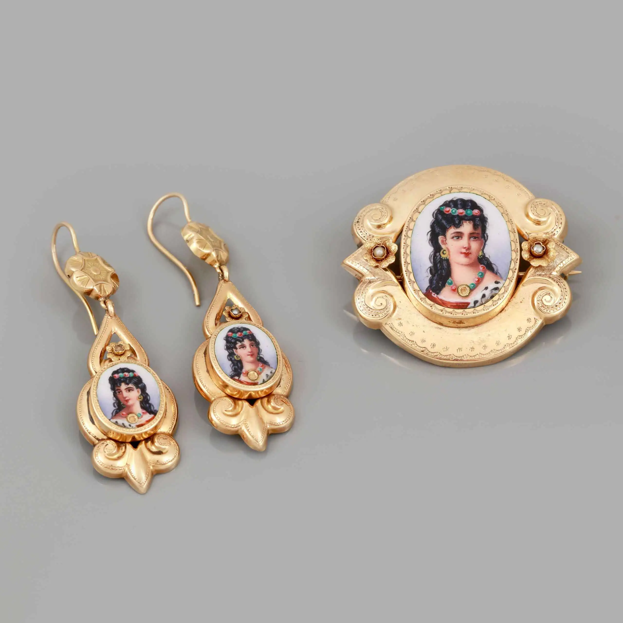 Alfinete e brincos (meio adereço) de ouro, gravados, esmaltados e cravejados com pérolas. Estojo da época.