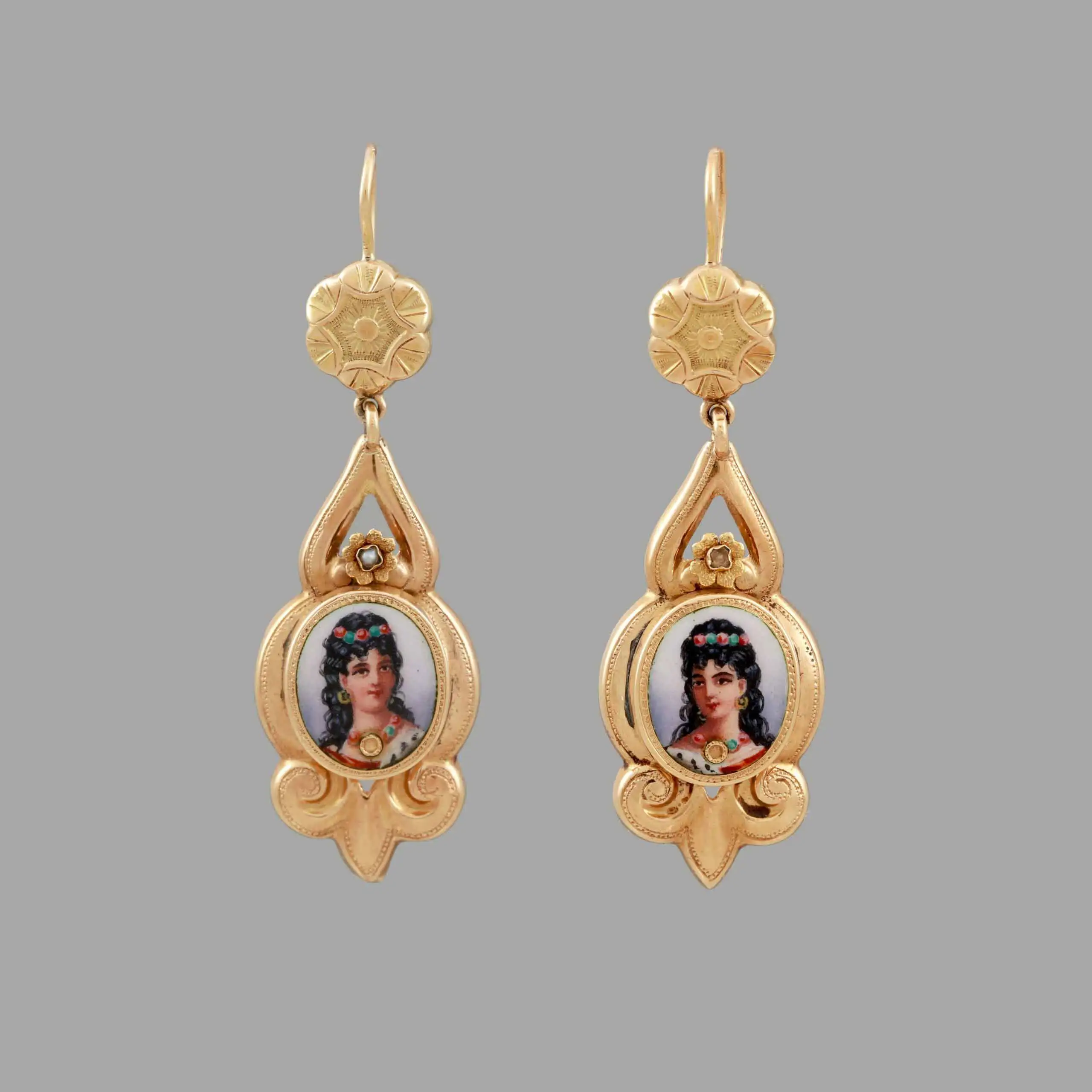 Gravados e esmaltados, decoração com bustos femininos, cravejado com 4 ½ pérolas.