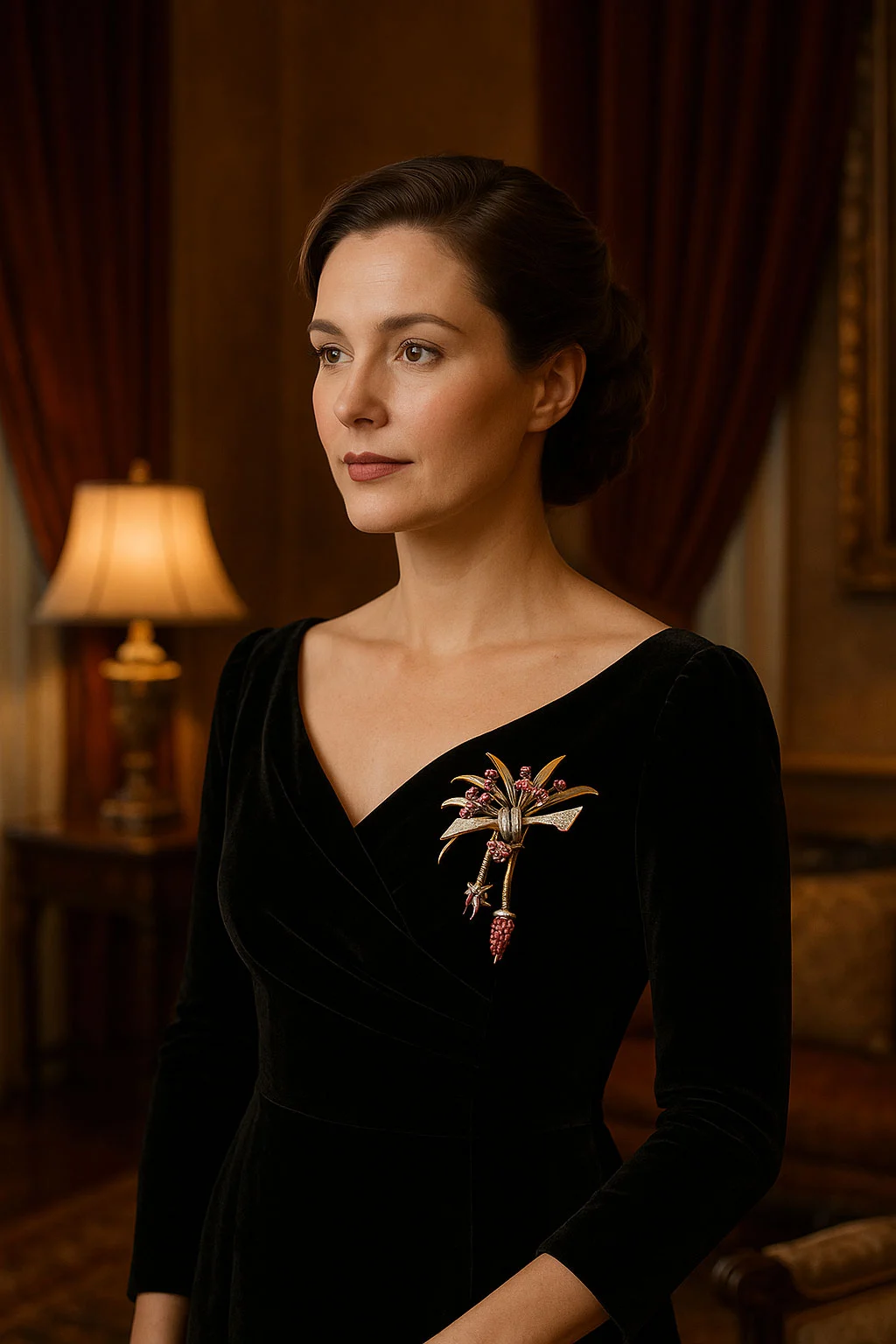 A joia apresenta composição floral de grande qualidade técnica, com volumes bem definidos e uso criterioso da platina na cravação, conferindo maior segurança e realce às gemas. O contraste entre o tom quente do ouro e o brilho frio da platina cria equilíbrio visual e sofisticação formal.