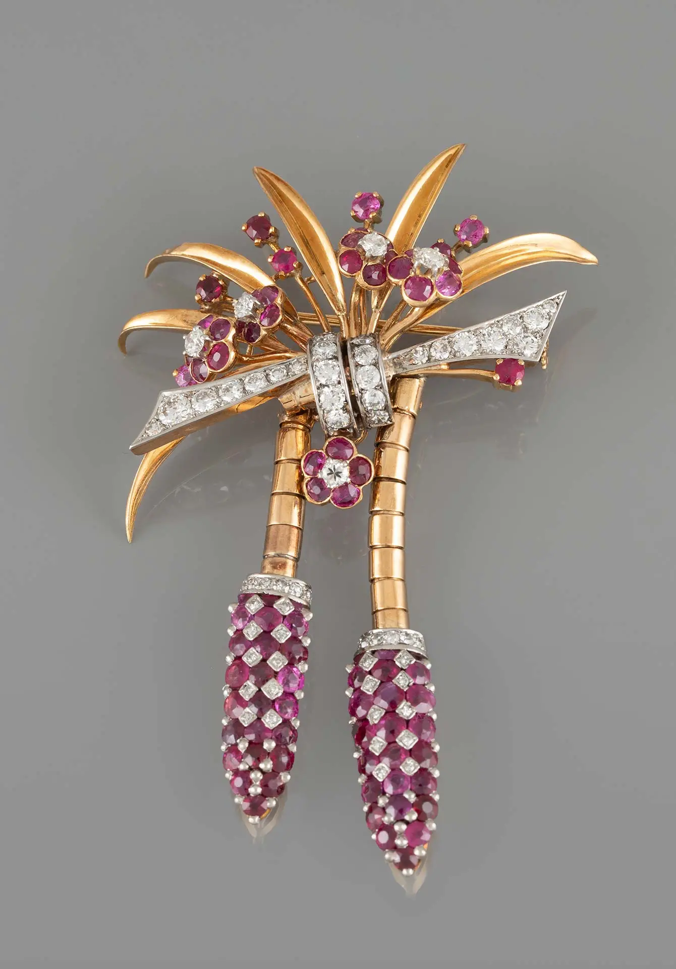 ALFINETE “FLORES” EM OURO, PLATINA, RUBIS E DIAMANTES