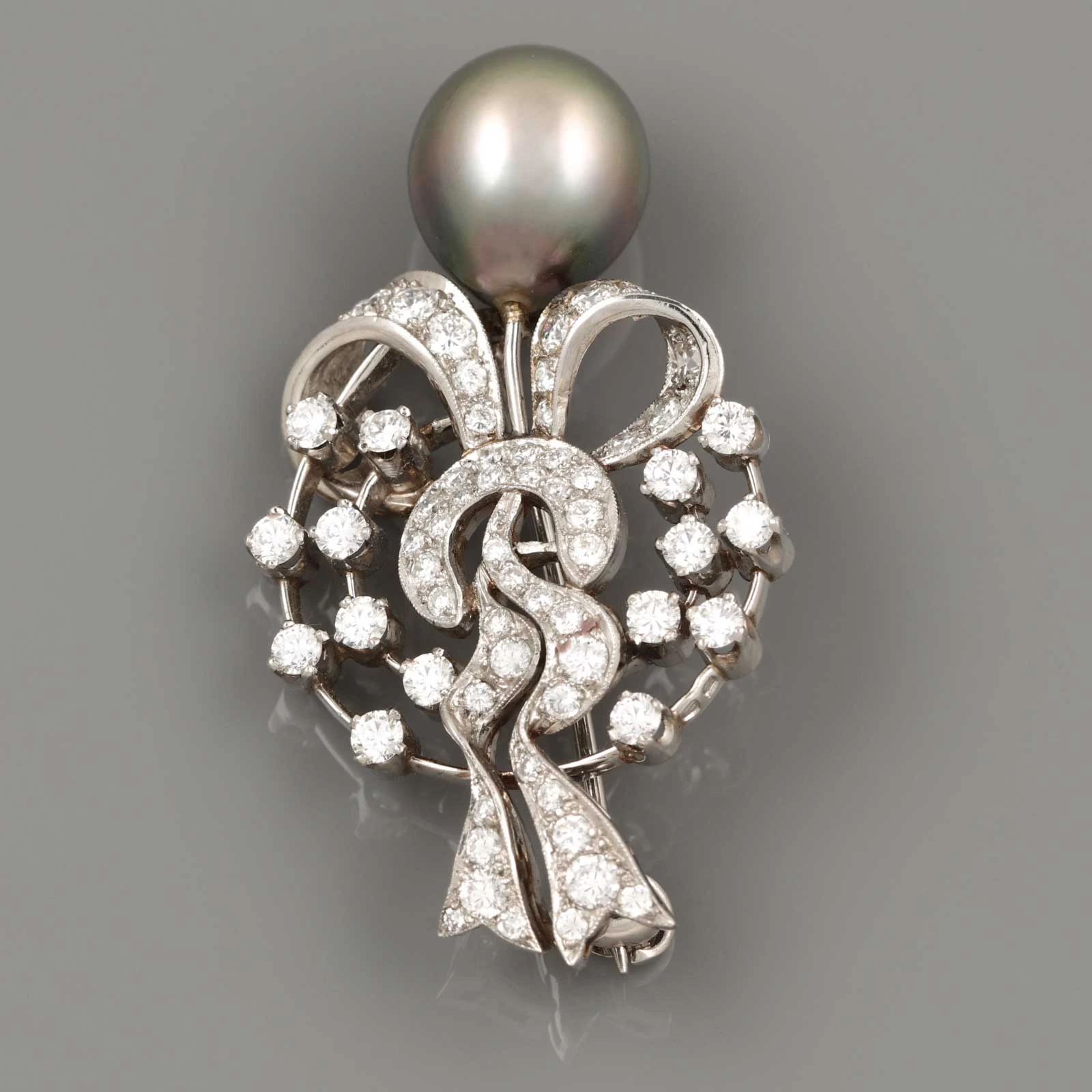 Alfinete de platina com diamantes e uma pérola negra.