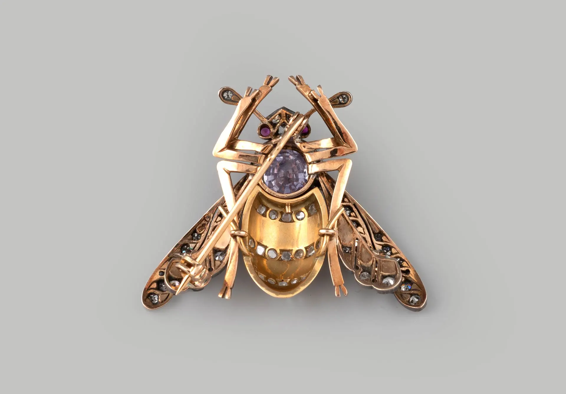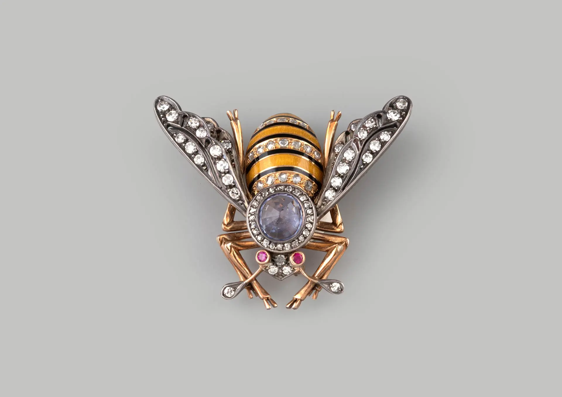 Cravejado com safira em talhe oval, 2 rubis, diamantes em talhe rosa e 33 em talhe 8/8 com o peso aproximado de 1 ct.