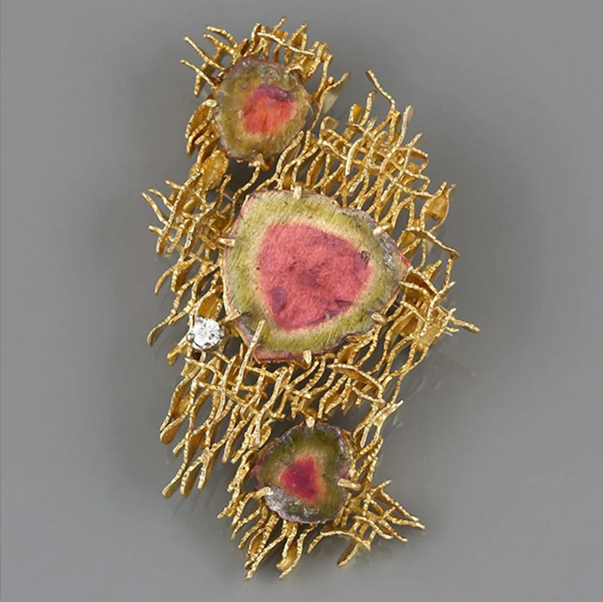 ALFINETE ALAN GARD EM OURO, DIMANATES E TURMALINAS