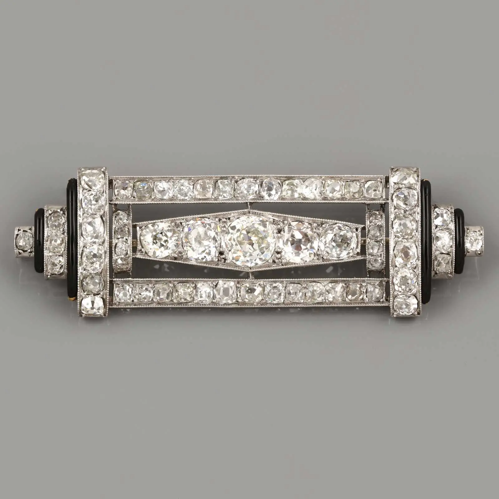 Platina (950 ‰), ouro (750‰/18k), diamantes e ónix. França, c.1930. Marca da contrastaria: França, “Cabeça de cão” e “Cabeça de águia”. Peso: 12,7 g. Peso total aprox. diamantes: 5.60 ct. Peso aprox. diamantes maior: 0.90 ct. |