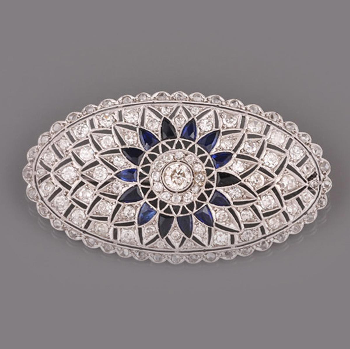 Alfinete Art Déco em platina, prata, diamantes e safiras.