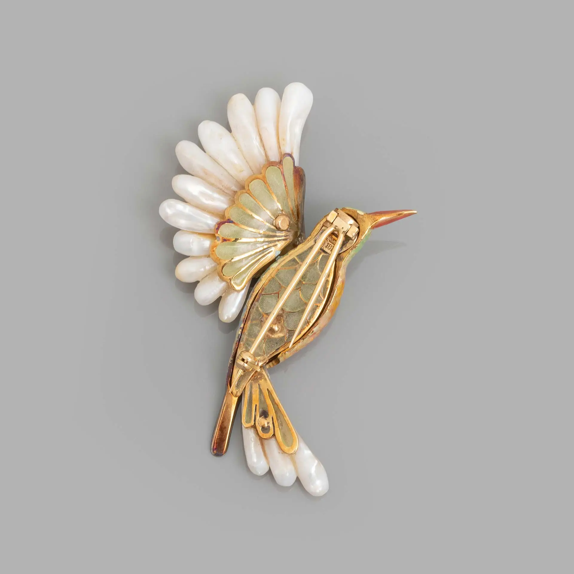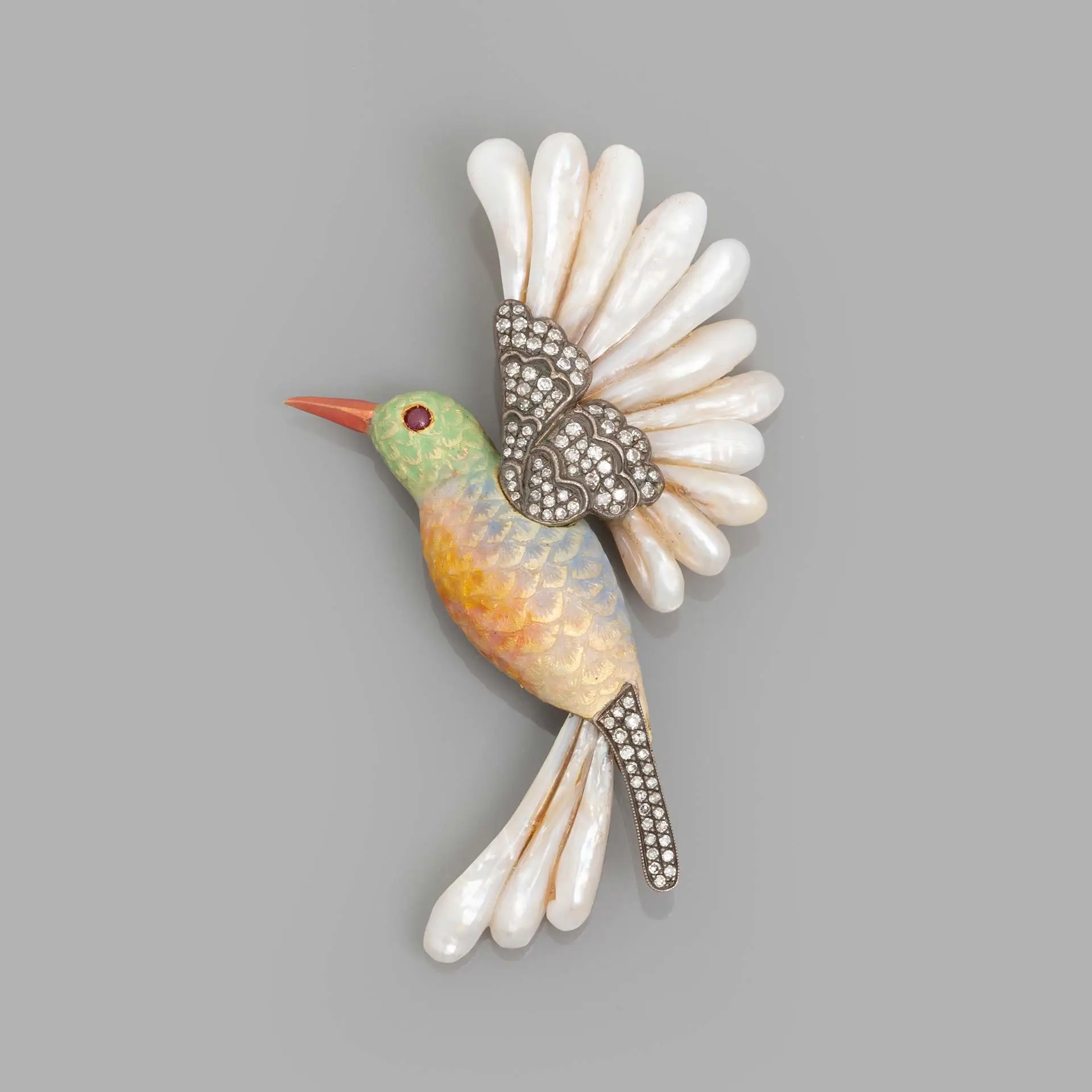 Aplicação de esmalte policromado e pérolas barrocas do Mississípi (não testadas), cravejado com rubi em talhe redondo e 94 diamantes em talhe 8/8 com o peso aproximado de 1 ct.