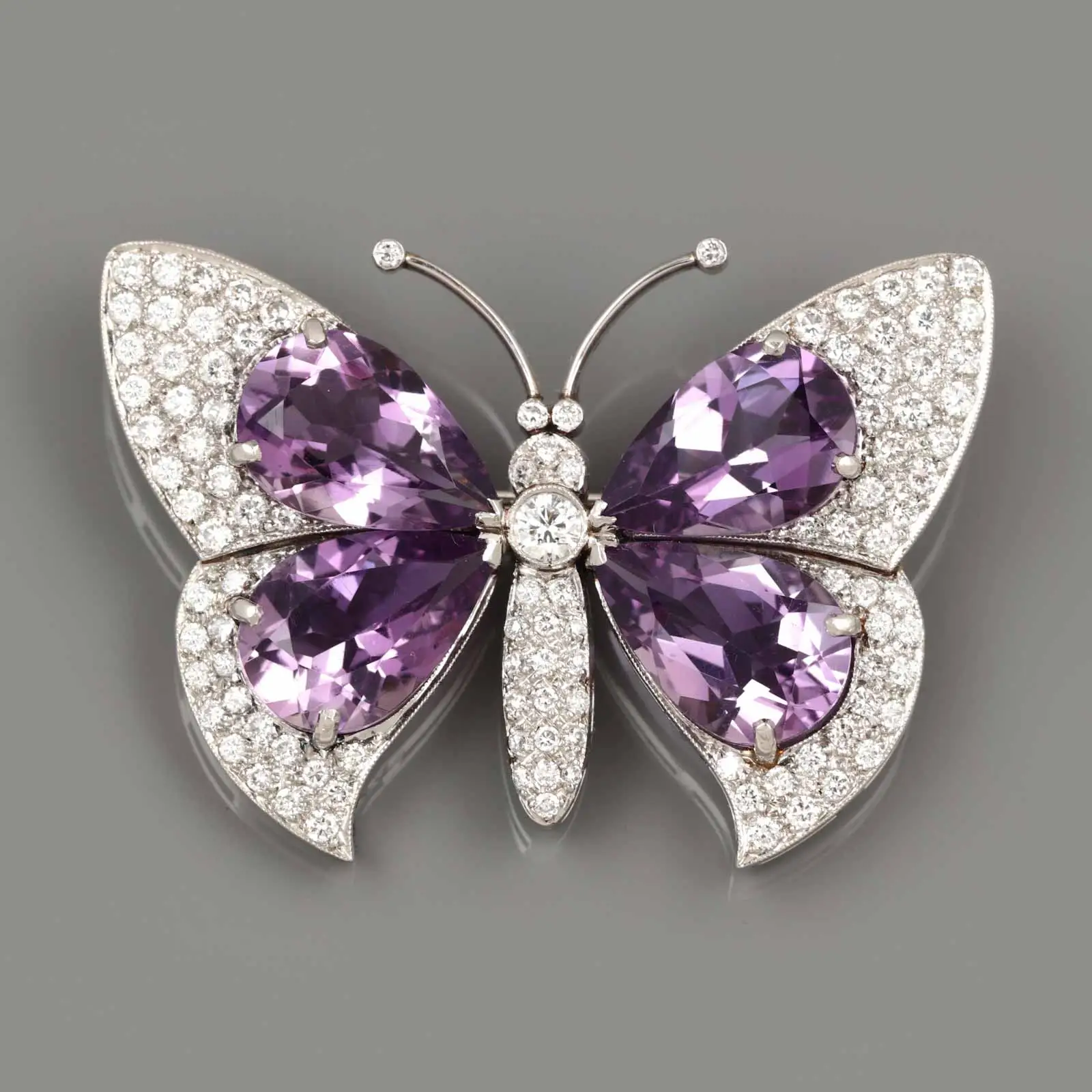 ALFINETE EM FORMA DE BORBOLETA EM PLATINA, DIAMANTES E AMETISTAS
