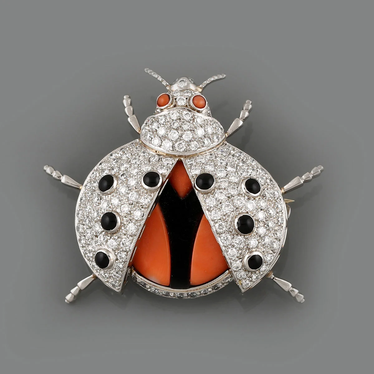 ALFINETE EM PLATINA, OURO, DIAMANTES, ÓNIX E CORA EM FORMA DE JOANINHA