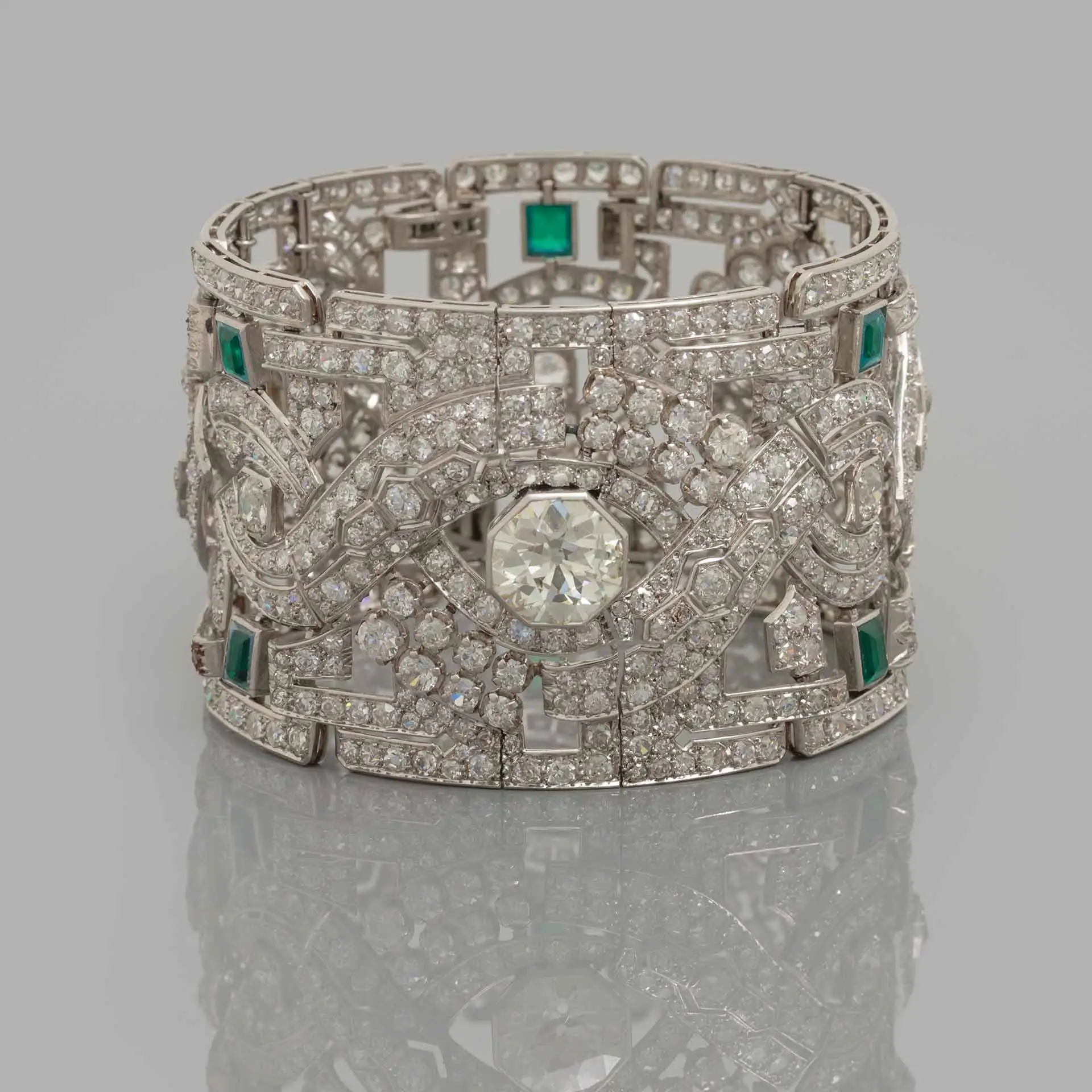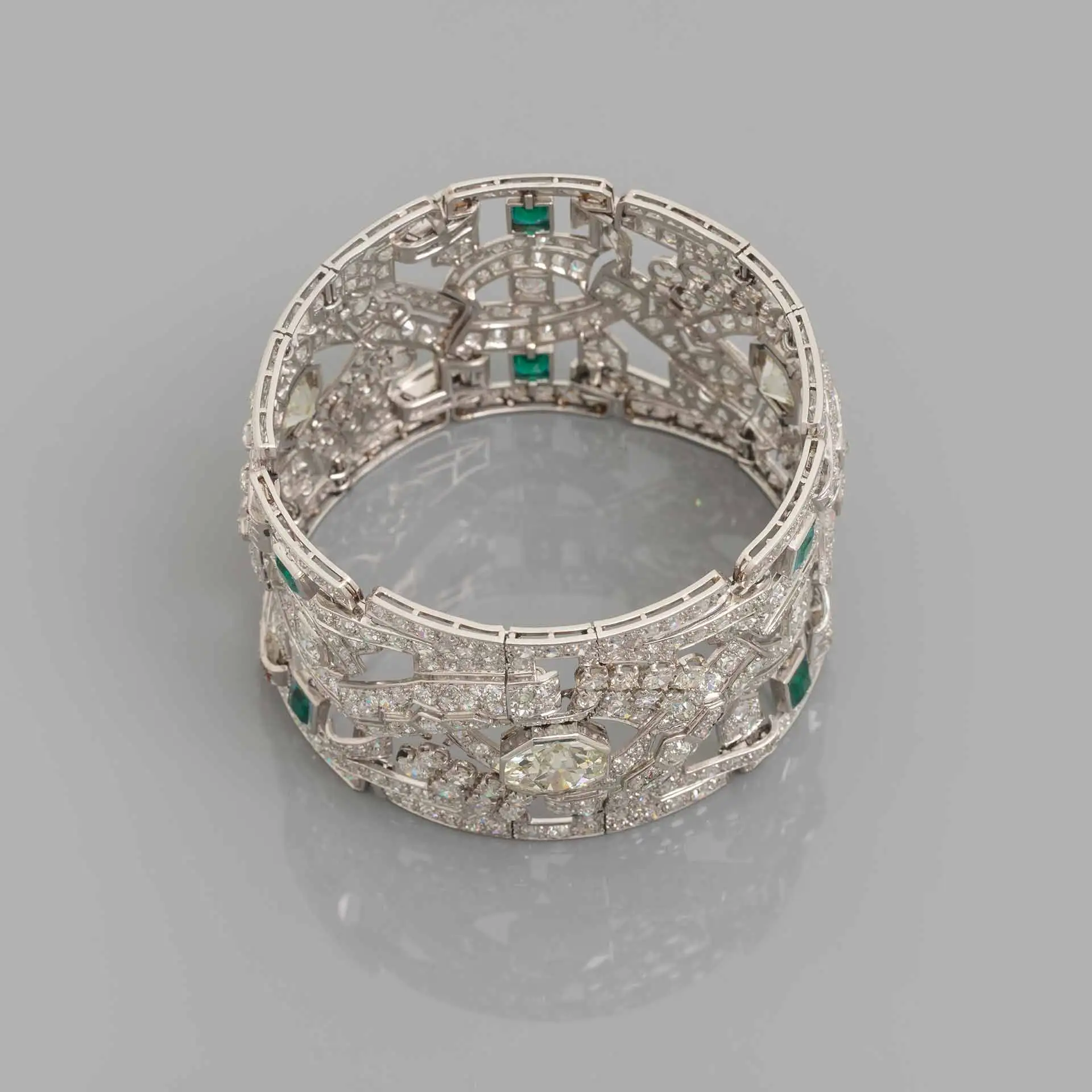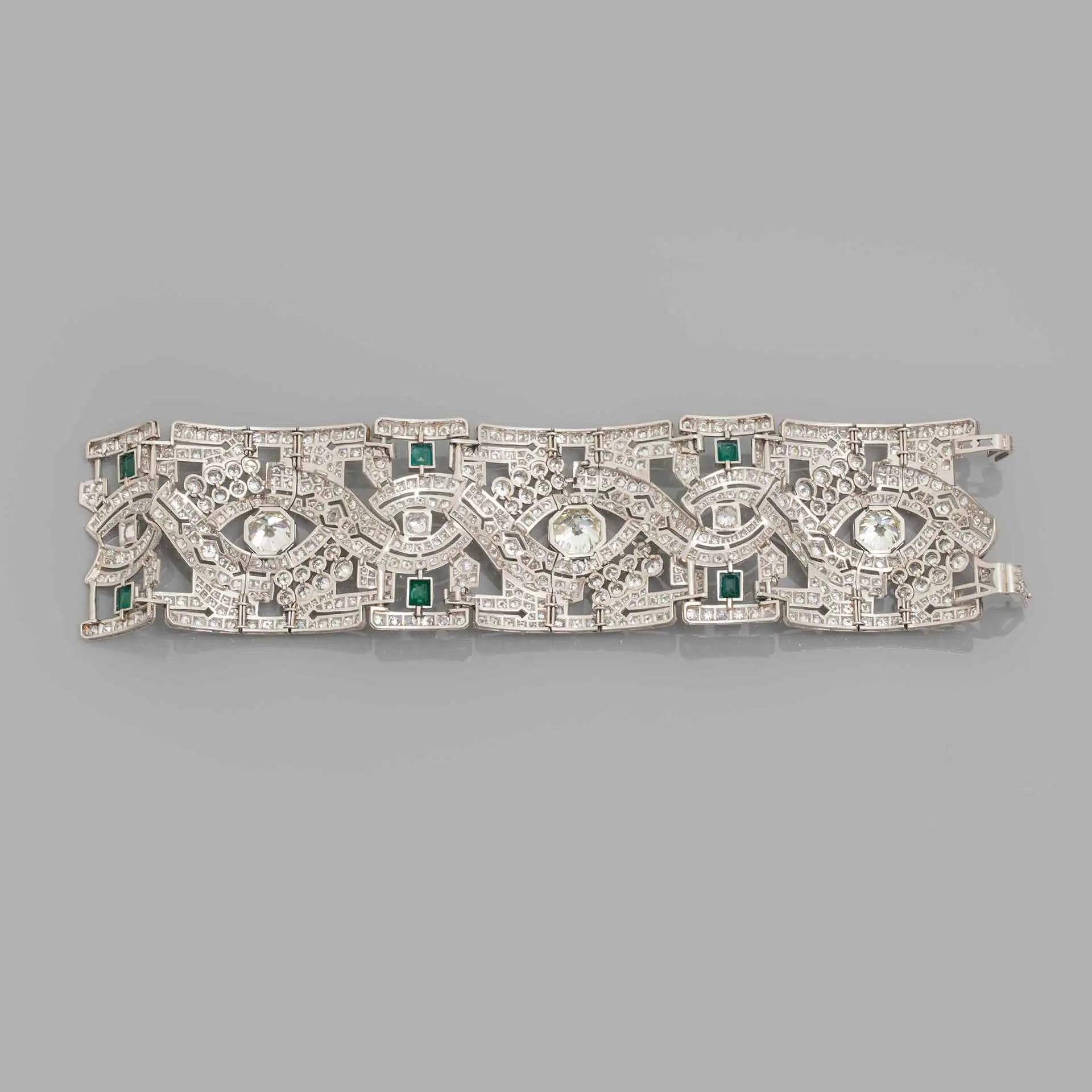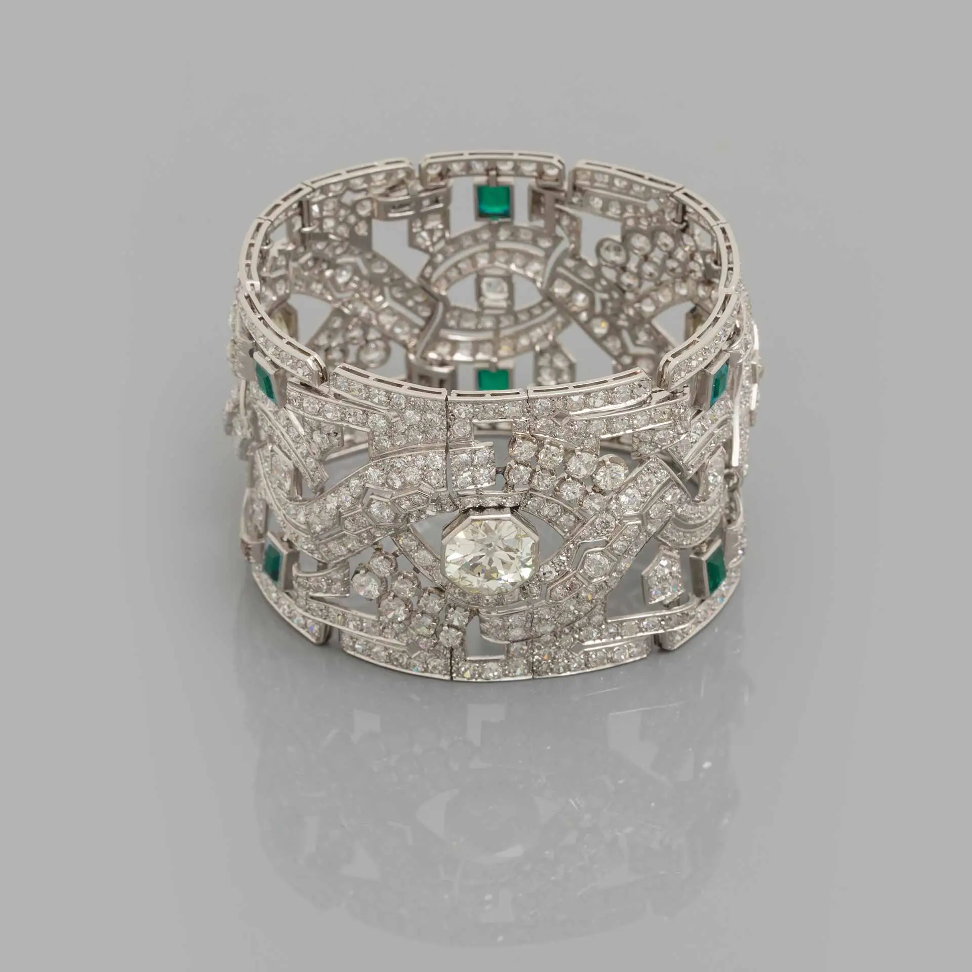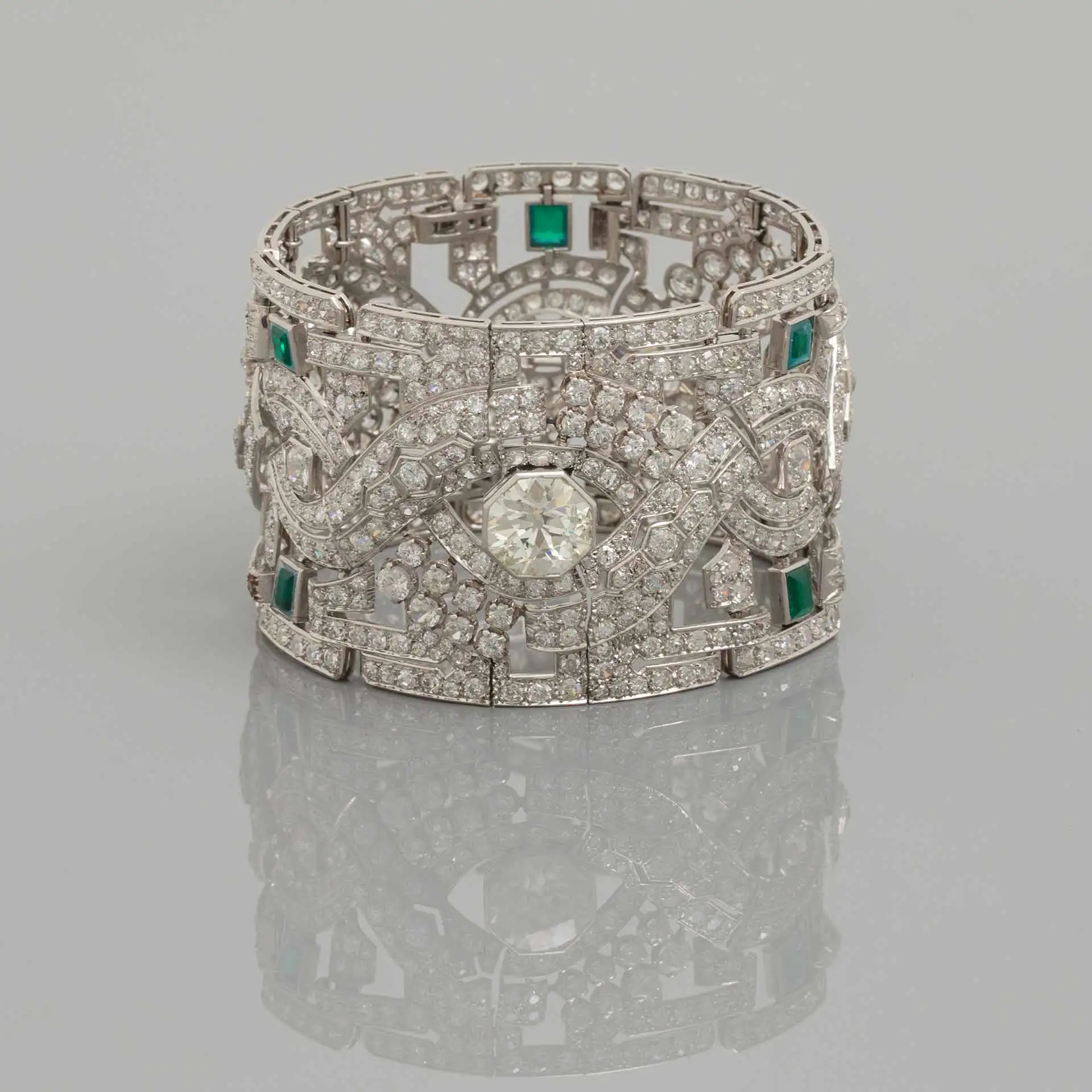 Diamante central em talhe brilhante de aproximadamente 4,00 ct, ladeado por 2 diamantes de cerca de 3,50 ct cada; os restantes diamantes, em diversos tamanhos, perfazem um total estimado de 45,00 ct.