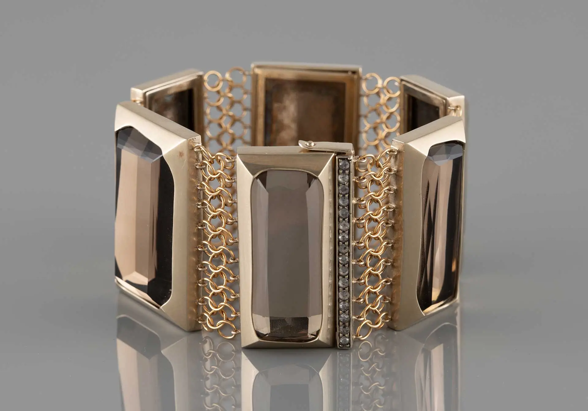 Ouro de 750/1000 e prata de 835/1000, cravejado com 6 quartzos, fecho cravejado com 17 diamantes em talhe rosa, brasileira, marcada H. STERN, marcada posteriormente com contraste português pós-2021.